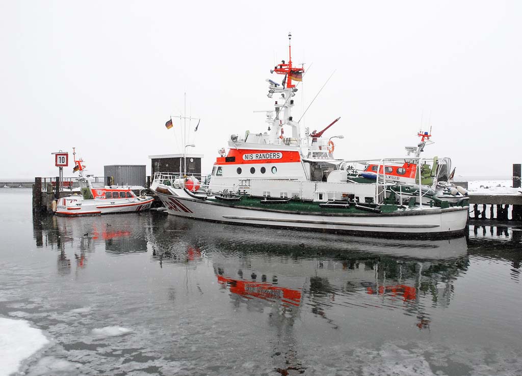 Seenotrettungskreuzer NIS RANDERS und Seenotrettungsboot FRANZ STAPELFELDT im vereisten Maasholmer Hafen